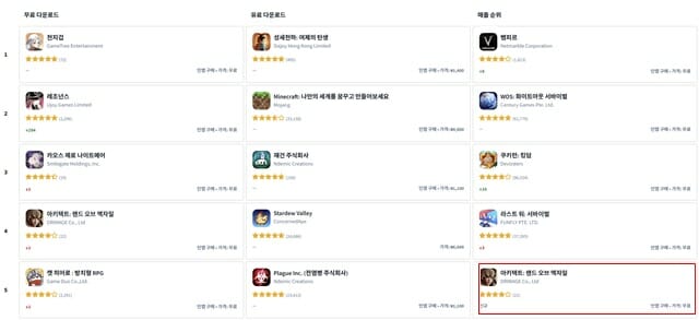 매출 순위 반영이 다소 늦은 구글 플레이 스토어에서는 '아키텍트'가 무료 다운로드 톱3에 올랐다. 이러한 흐름이 이어진다면 구글 매출 순위도 단기간 급상승할 것으로 예상된다.