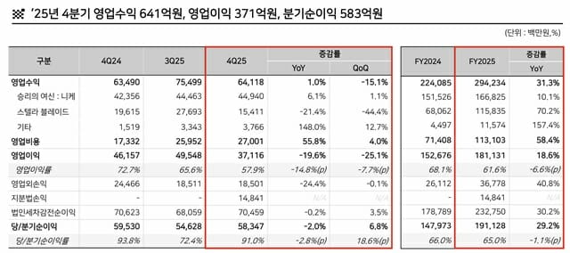 지난해 4분기 매출은 641억 1800만원, 영업이익은 371억 1600만원을 기록했다. 같은 기간 당기순이익은 583억 4700만원으로 나타났다.