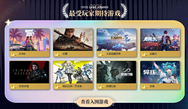 이용자가 뽑은 가장 기대되는 게임 부문에서 해외 게임으로는 붉은사막과 GTA 6만 선정됐으며, 나머지 선정작은 중국 게임들로 구성됐다. '17173 에디터 선정 글로벌 기대작’ 부문에는 GTA6, 마라톤, 툼 레이더: 레거시 오브 아틀란티스 등 글로벌 주요 기대작들이 함께 포함됐다.