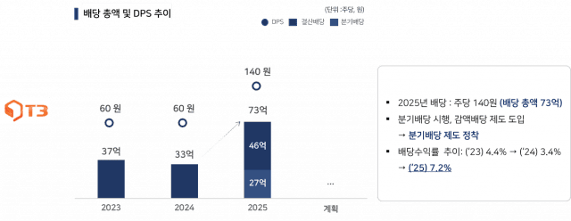 티쓰리는 분기배당을 통해 안정적인 현금 흐름 기반의 주주환원 체계를 구축함으로써 장기 투자 관점에서의 주주가치 제고를 도모한다.